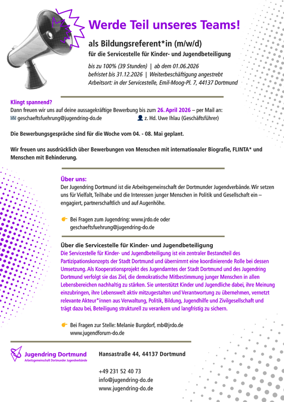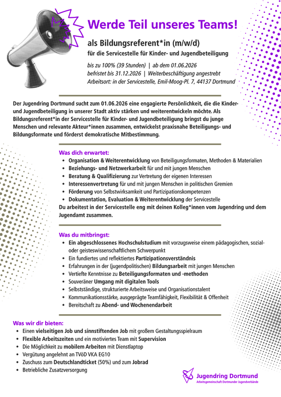 Arbeitsort: in der Servicestelle für Kinder- und Jugendbeteiligung, Emil-Moog-Platz 7, 44137 Dortmund