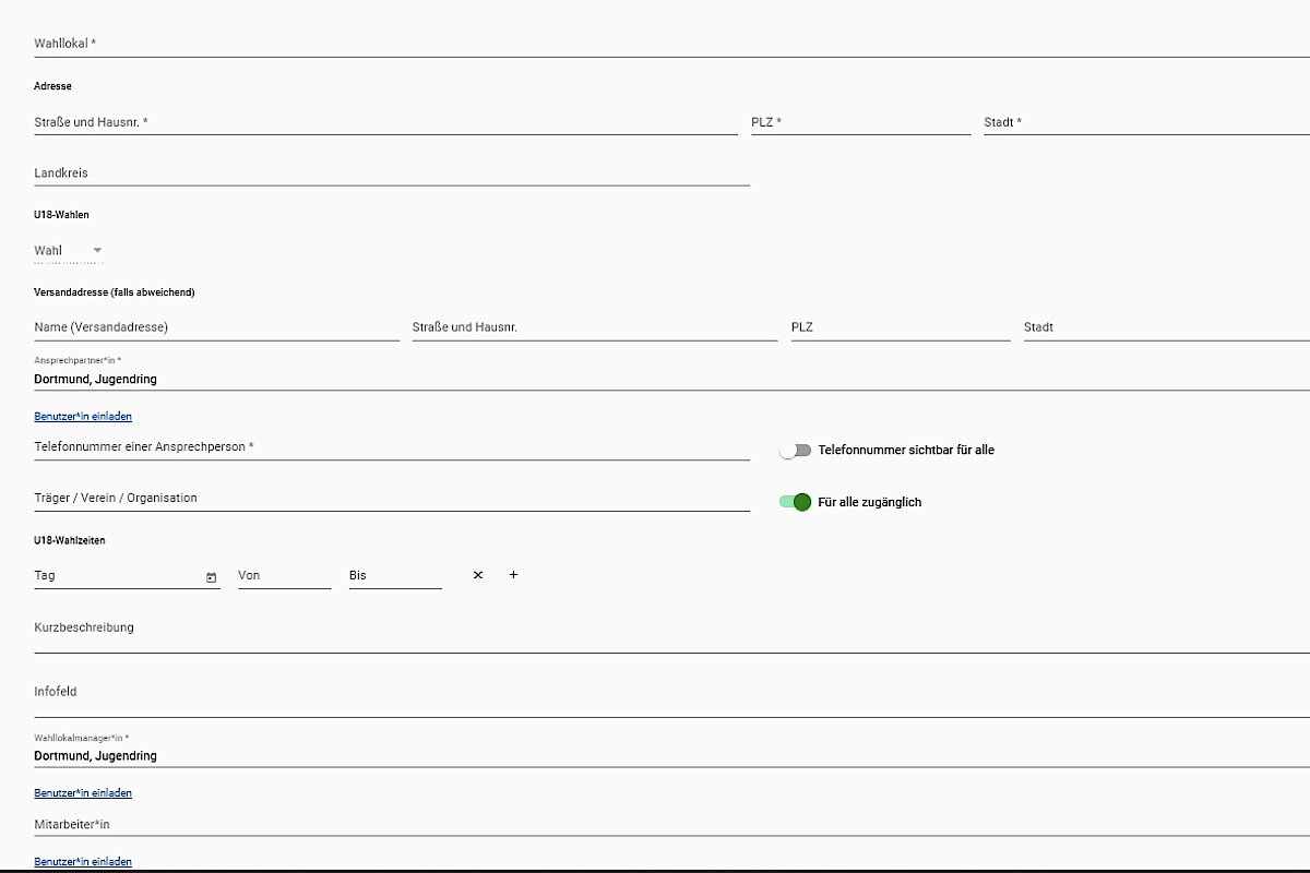 - Mitarbeiter*in: Ihr könnt hier weitere Personen eintragen, die in eurem Wahllokal mitarbeiten. Große Änderungen am Wahllokal kann nur ein*e Manager*in vornehmen, aber Mitarbeiter*innen haben auch Zugriff auf die Ergebniseingabe.