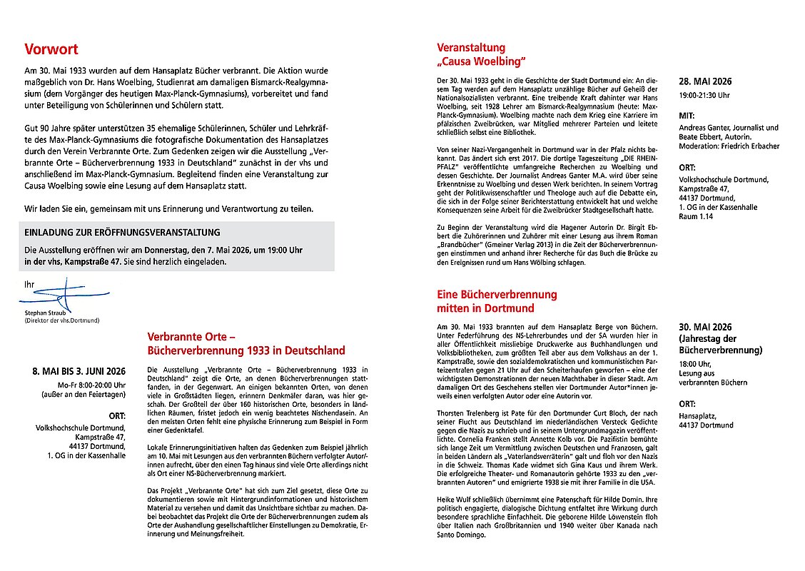 30. Mai (18:00 Uhr): Lesung aus verbrannten Büchern auf dem Hansaplatz – genau am Jahrestag der Bücherverbrennung in Dortmund