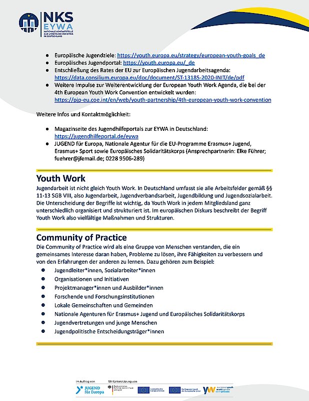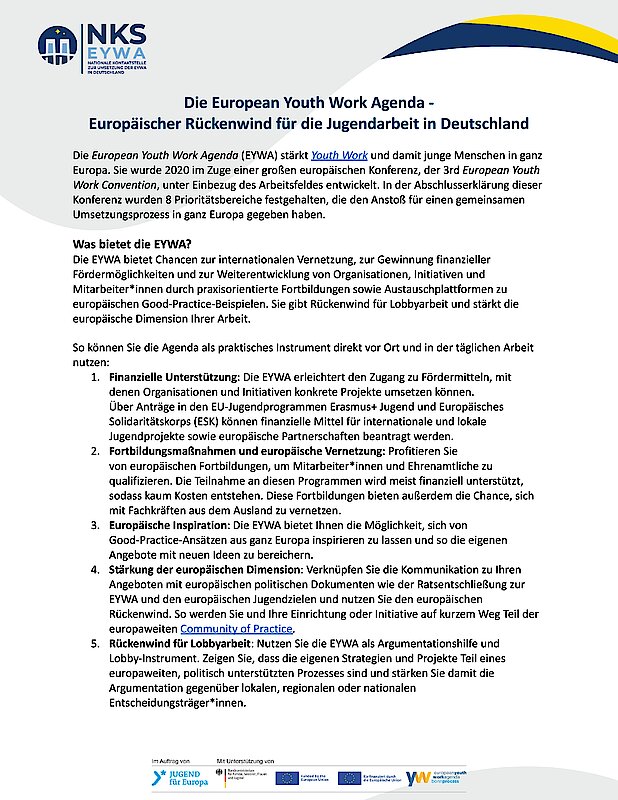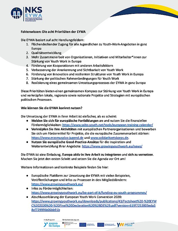 Die Nationale Kontaktstelle zur Umsetzung der EYWA (NKS EYWA) unterstützte dabei Kommunen in Deutschland, die internationale Jugendarbeit weiterzuentwickeln. Dabei fokussierte sich die NKS EYWA in Deutschland auf drei Bereiche der EYWA: Qualitätsentwicklung, Annerkennung & Sichtbarmachung und Vernetzung von Fachkräften.